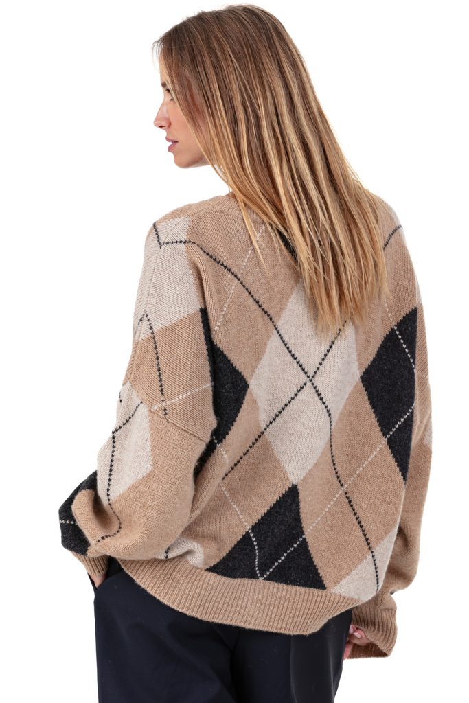 Original and full of character, the PANDORE women’s cardigan in camel hair enchants with its retro style and vintage tricolour effect. Knitted in 100% 2-ply camel hair, it stands out with its checked pattern and generous cut. A V-neck, button placket, and long sleeves make it an easy-to-wear layering piece that remains graphic and modern.