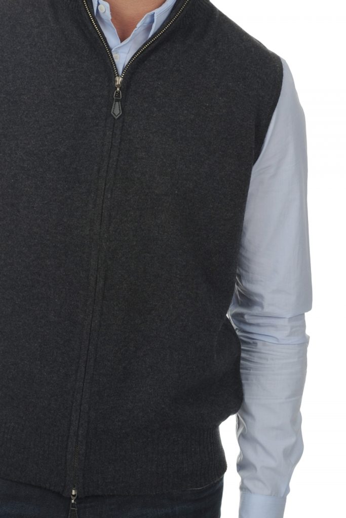 100% kashmir, totrådet kashmirgarn. Herrevest med høj krave og lynlås med dobbeltlukning. Nederst dekoreret med karakteristisk ribkant.